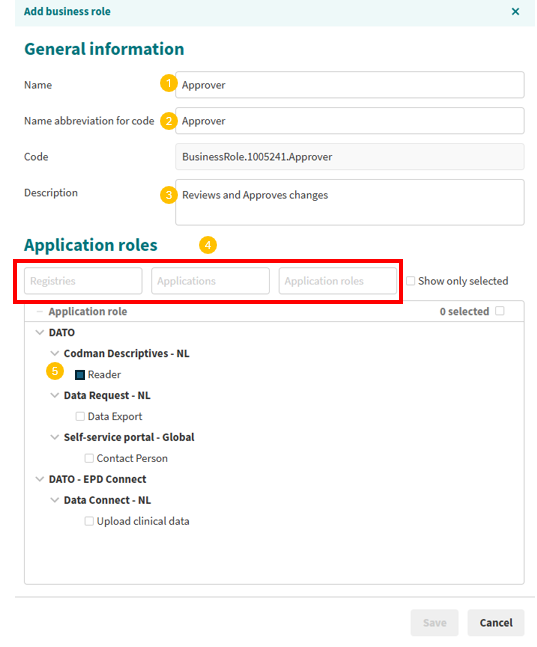 As an organisation administrator, you are responsible for managing users, roles, and access rights within your organisation. In the Self Service Portal, you manage this using business roles and application roles: business roles bundle the standard permissions associated with a job profile, while application roles determine the specific access within a registry.