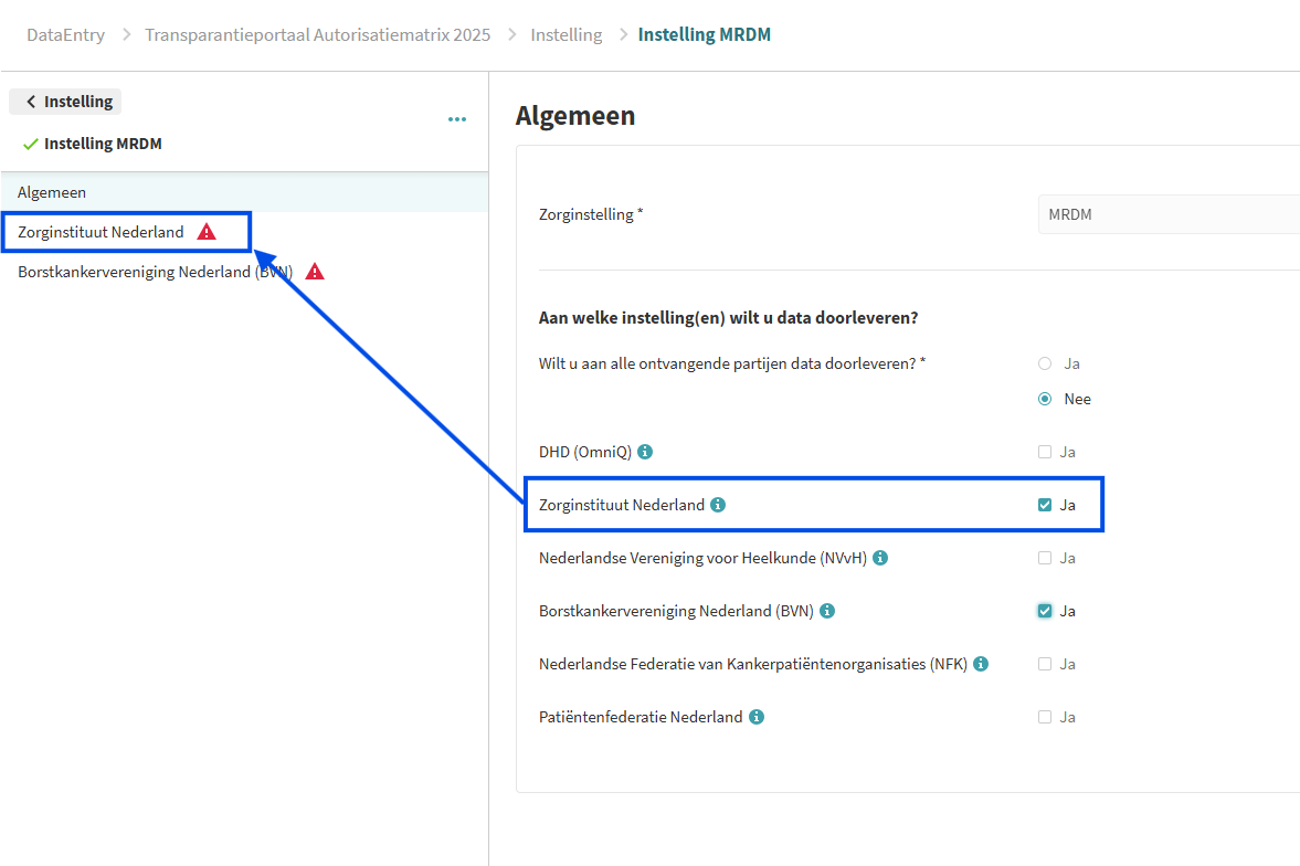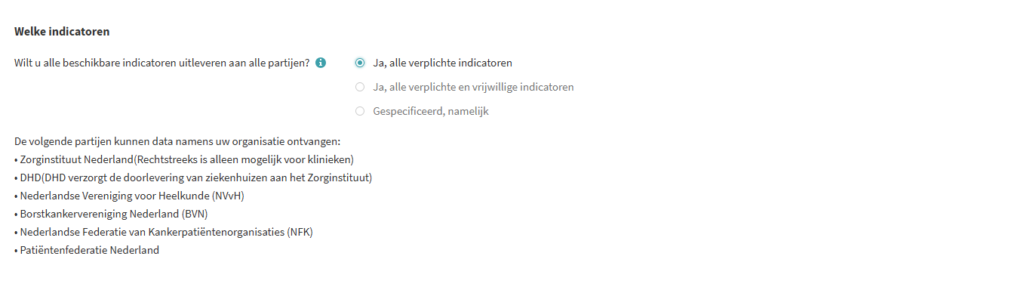 Het is mogelijk om de indicatoruitkomsten voor uw organisatie te specificeren en te delen met alle beschikbare externe partijen. In de sectie ‘Algemeen’ beantwoordt u de vraag ‘Wilt u aan alle ontvangende partijen data doorleveren?’ met ‘Ja’.