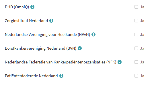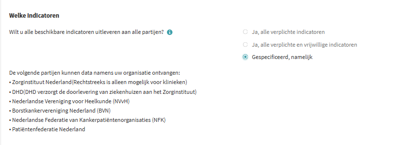 Het is mogelijk om per ontvangende partij te bepalen welke indicatoruitkomsten namens uw organisatie gedeeld worden. In de sectie ‘Algemeen’ beantwoordt u de vraag ‘Wilt u aan alle ontvangende partijen data doorleveren?’ met ‘Nee’.