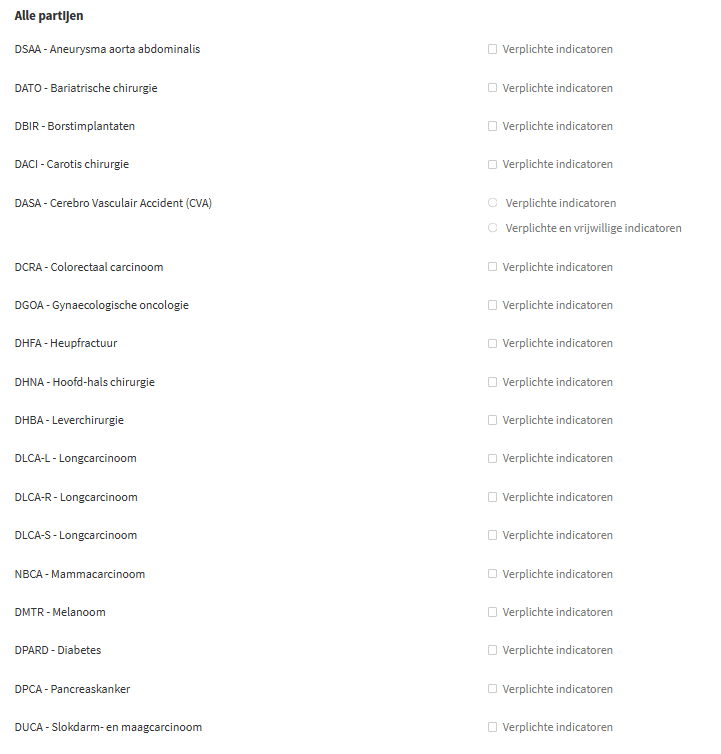 Daarna kunt u per registratie aangeven of u deze wilt doorleveren aan de beschikbare ontvangende partijen. Op het moment dat er voor een registratie geen vrijwillige indicatoren beschikbaar zijn zal alleen de optie ‘Verplichte indicatoren’ getoond worden. Wanneer er wel vrijwillige indicatoren beschikbaar zijn zullen de opties ‘Verplichte indicatoren’ en ‘Verplichte en vrijwillige indicatoren’ getoond worden.